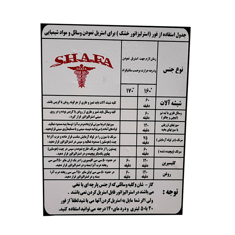 توجه داشته باشید جهت استریل کردن باند ، گاز ، شان و سایر محصولاتی که پارچه ای (دارای بافت نخی) میباشند فقط حجم 55 لیتری پیشنهاد میشود و بخاطر حرارت بالا آسیب نرسیدن به ابزار ، باند ،گاز ، شان و … داخل فویل یا بیکس گذاشته شود.